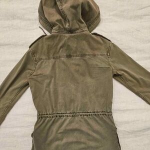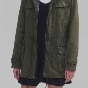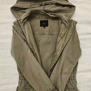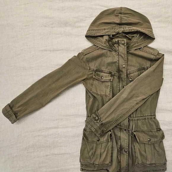Stylish utility jacket with a hood. Features multiple pockets. Perfect for layering.