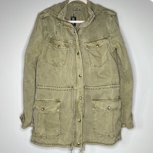 Stylish utility jacket by Talula. Features multiple pockets. Drawstring waist for a tailored fit. Perfect for layering.