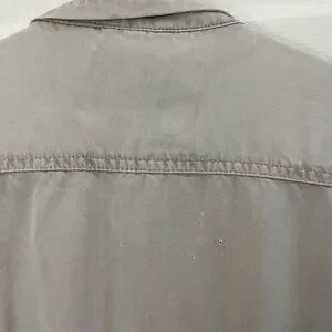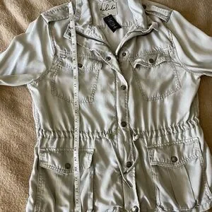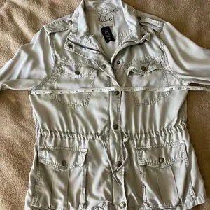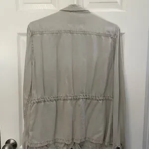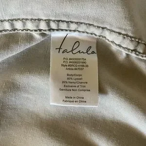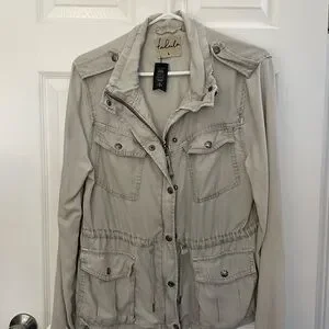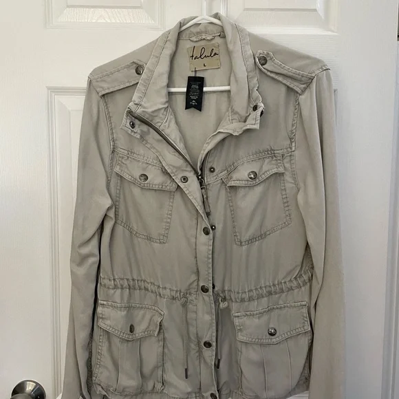 Chic utility jacket by Talula, size large, greige colour. Features multiple pockets and button details. Ideal for layering. Super soft, made with 20% hemp.