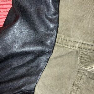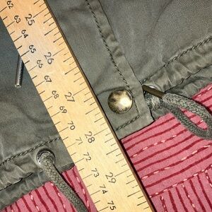 Fair used condition due to some DAMAGE to sleeves due to washing. Lovely fit, cut, fabric and design with lots of pockets, zip and snap closures and drawstrings. Sleeves are leatherette.