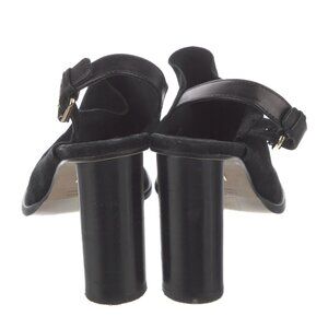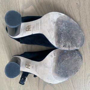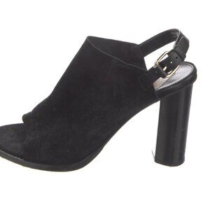 Suede slingback sandals with straps and buckle closure at back. Approx. 4" heel