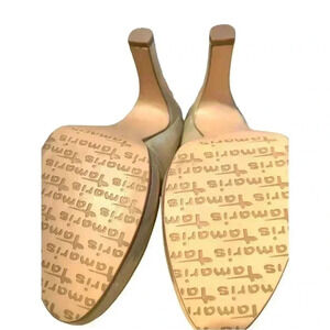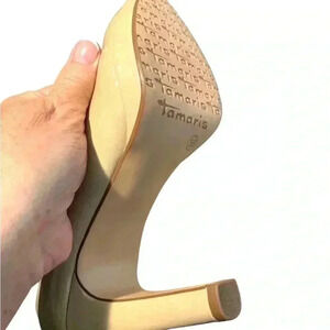 Tamaris is a quality brand from Germany. These are patent leather, have a 4 inch heel and a half inch platform. At the widest point, they measure 3 inches inside.