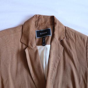 Super soft and light tan blazer jacket with single button and soft shoulder padding from Le Chateau. Great for the dressy/casual oversized blazer look! Gently worn (about 5 times). Size is XS but fits looser for oversized feel.