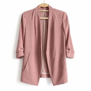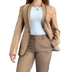 Elevate your style with this sophisticated tan blazer featuring elegant brown trim.