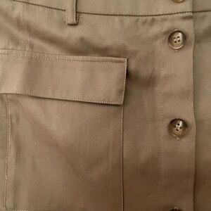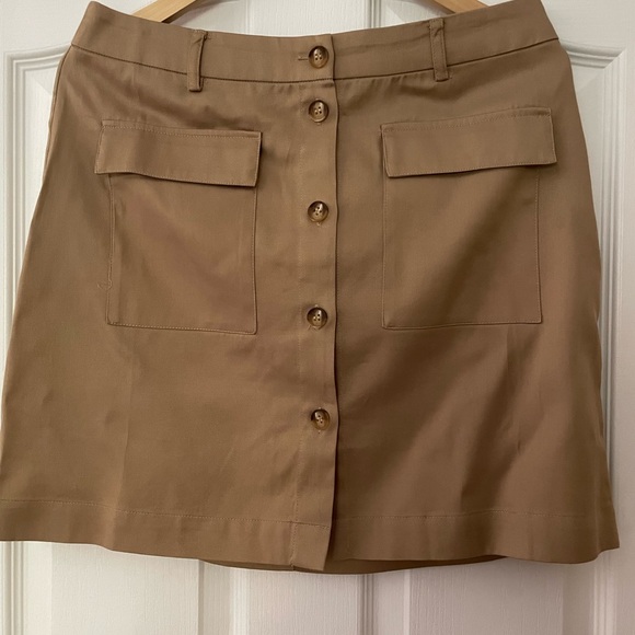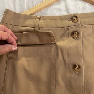 NWT Stylish tan skirt with button-front design. Features two front pockets.