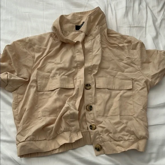 Elevate your style with this chic tan button-up jacket. Perfect for layering, this versatile piece adds a touch of elegance to any outfit.