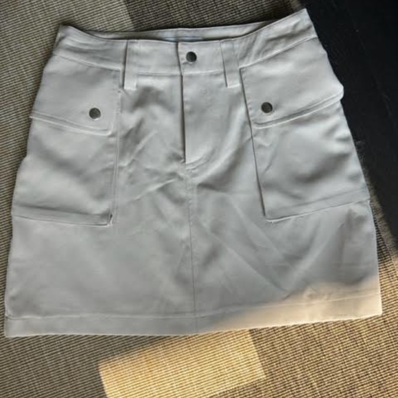 Cute, preppy cargo mini skirt from Greylin. Two cargo pockets on side. Zip front. Sits above knee. Polyester/Rayon/Spandex blend.