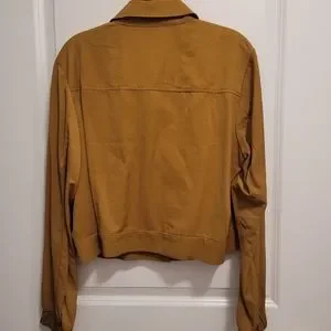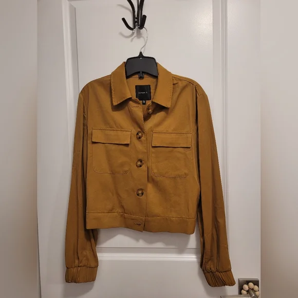 Stylish tan cropped jacket with button closure. Perfect for a chic, casual look.