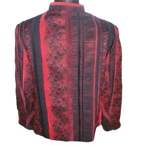 Stylish blazer with red and black patterned brocade style fabric. Has padded shoulders zippered front closure and 2 side pockets.