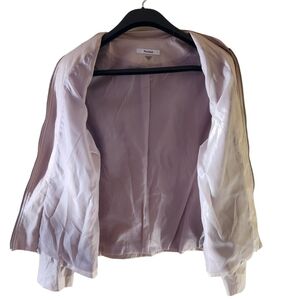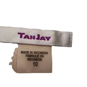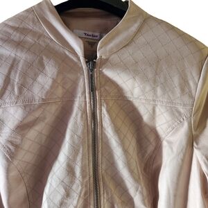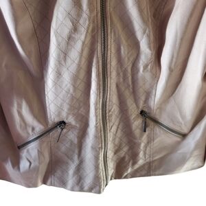 Tan Jay, beige faux leather, long-sleeve, zip-up jacket. Zip-up front with two front zippered pockets, diamond type design in the front and back, shoulder pads,polyester lining. Super comfortable,lightweight and in very good condition size 10