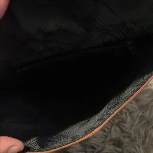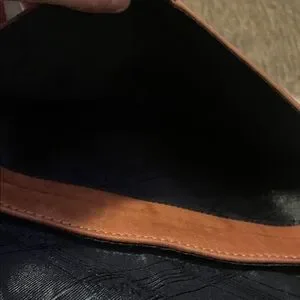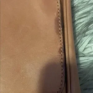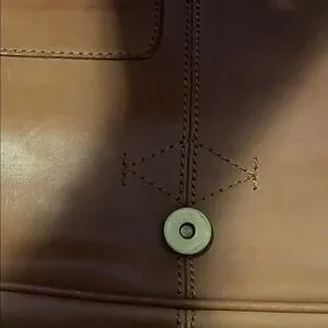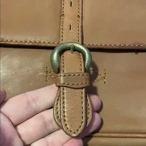 Stylish tan leather hand bag with buckle detail. Perfect for everyday use. this bag has some marks on it. but the inside is like new. this hand bag is old it was my grandfathers 35 years old. just had the hand strap 12 inches long. wide 11 1/2 inches