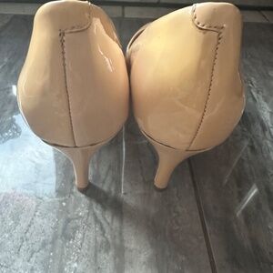 These are a pair of Tan, creamy coloured high heel kitten shoes. They are a size 10, not for wide width feet. They are a Brand new unworn item. Some scuffs on the bottom. I'm thinking due to being on display. Also some slight discolouration as you can see in some of the photos.