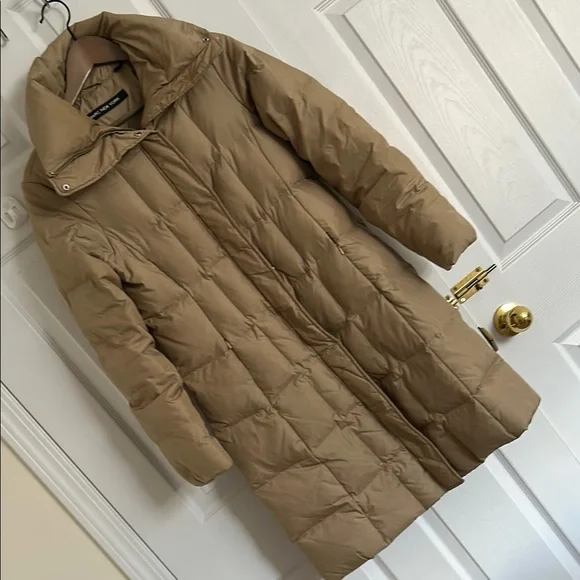 Stay warm and stylish with this tan puffer jacket. Perfect for chilly days.