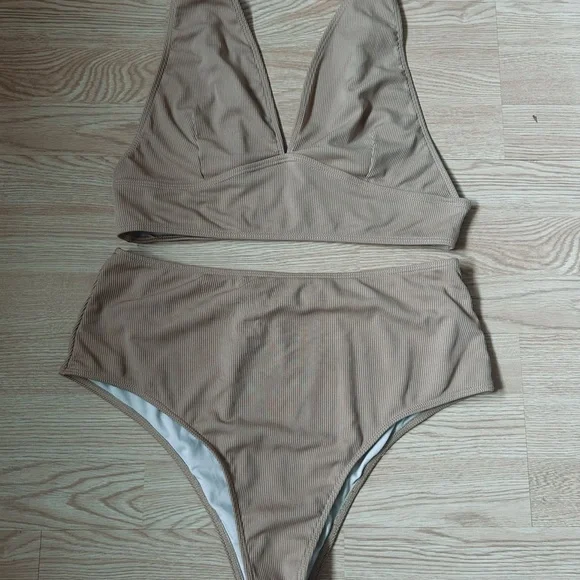 Stylish tan ribbed bikini set. Features a deep V-neck top and high-waisted bottoms.