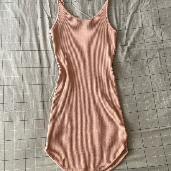 Stylish tan ribbed sleeveless dress. Perfect for casual outings.