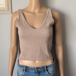 Tan Ribbed V-Neck Stretchy Crop Top SZ XS/S