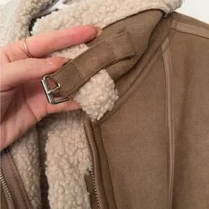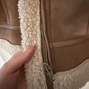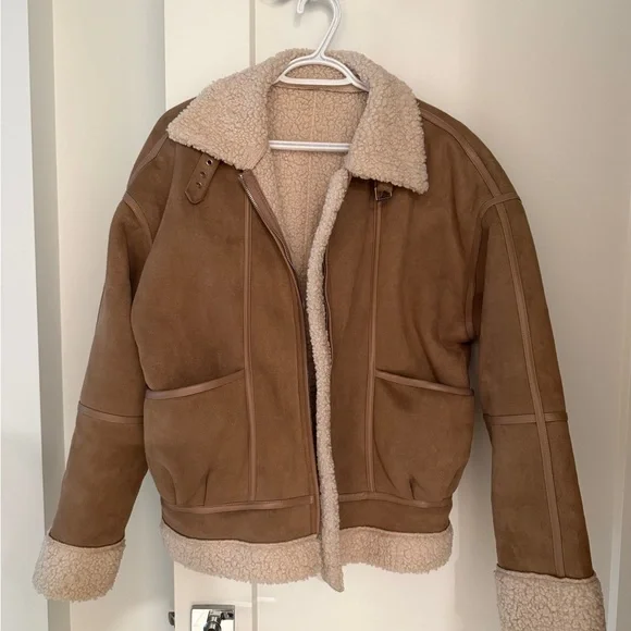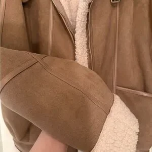 Stylish tan shearling jacket with cozy lining. Perfect for cold weather.