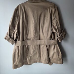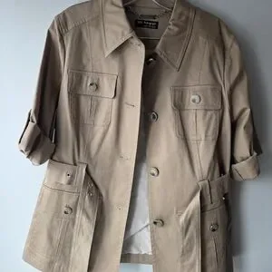 Stylish tan utility jacket with multiple pockets and button details. Perfect for casual outings.