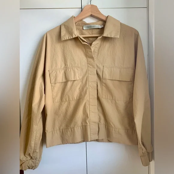 Stylish tan cropped light jacket with front pockets. Ideal for casual wear.