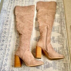 Tan vegan suede over the knee stacked wooden heel boots from Call It Spring, size 7.5. In great used condition. Cat friendly, nonsmoking home.