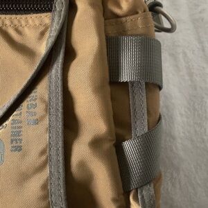 Tan and Gray Belt Bag with Durable Fabric and Metal Accents
