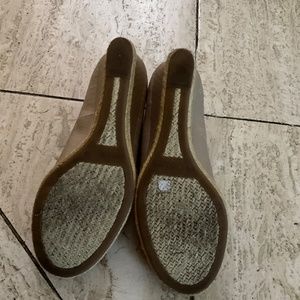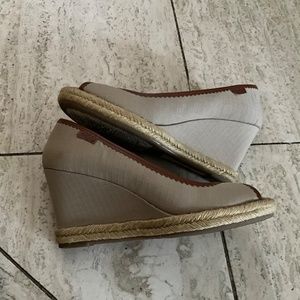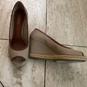 Lauren peep toe beige fabric wedges 3 1/2” heel height with leather trim.