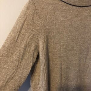 Tan sweater with shimmer gold thread. The neck is a rolled mock neck and the length is below the waist.