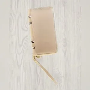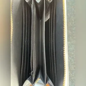 Two sides to keep cards/bills/receipts and one coin pouch. Comes with wristlet.
