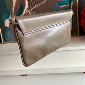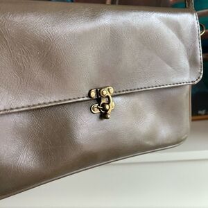 This tan crossbody bag features a sleek, structured design with a smooth leather-like finish. The gold-toned clasp adds a touch of elegance, while the adjustable strap ensures comfort and versatility for everyday use.