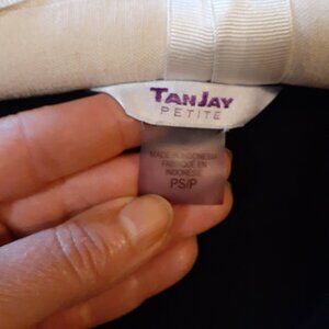 Pre-owned and in good condition. TanJay black asymmetrical blouse. Slightly longer in the back. Front has an asymmetrical appearance with one side longer than the other. V neck. 3 quarter sleeves. Different layers of fabric give the blouse a lot of movement. It is very flattering to wear. Small amount of pilling on the front.