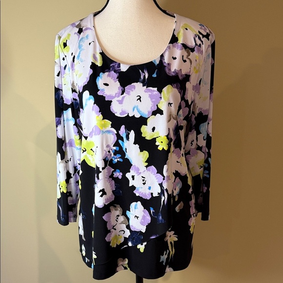 This TanJay top is a long-sleeved, scoop-neck shirt featuring a vibrant floral pattern on a dark background. The pattern consists of abstract floral shapes in shades of purple, white, and lime green, with some lighter blue accents. The top has a relaxed fit and is made of a soft, comfortable fabric. There is double layer effect in the front of this top, where the top layer is cut away in a gentle curve, exposing the bottom layer, contributing to a flowing feminine silhouette. Perfect for Office, Work, Business, Party, Casual. Dress it up with trousers or skirt, or dress it down with jeans or leggings. Has stretch.