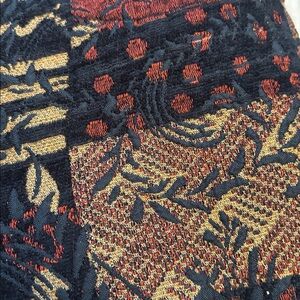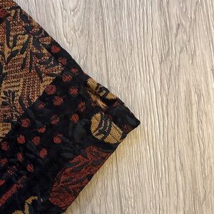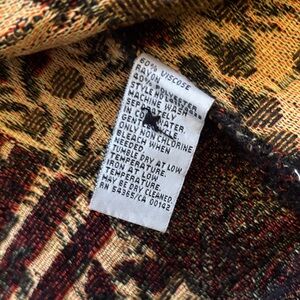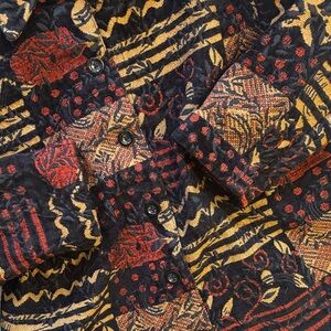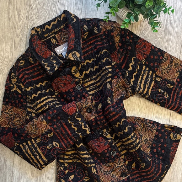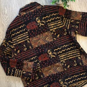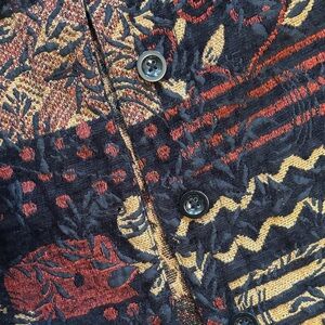 Elegant TanJay retro jacket with intricate red, black and sand patterns. Textured fabric. Features bold designs for a standout look. Small - medium depending on desire fit