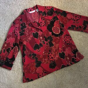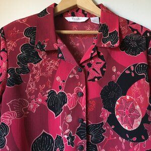 Very good preowned condition, black and red, retro, shoulder pad shirt by TanJay Petites with black detailed button down closure. The pattern is so interesting. I don't know what it was inspired by, but it reminds me of playing cards and the strong contrasting colours and distinctive suits. Bold colour palette: red, black, pin, burgundy and white.