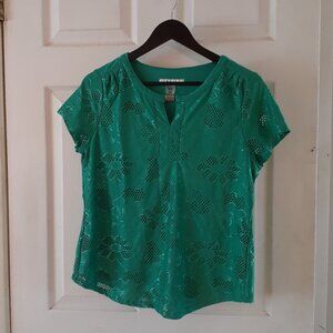 Emerald green short sleeve TanJay top, with silver bar detailing (at neck and lining). Size M. Pre-owned, but still in good condition. Polyester/spandex blend.