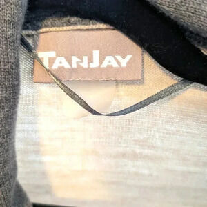 This acrylic cardigan by TanJay has an open front. It features a minimalist abstract pattern in grey, beige, brown, and light blue. The fabric is a good weight and there is enough fabric in the design that the open front can be wrapped shut.