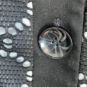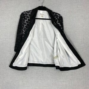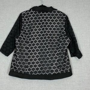 TanJay Petites Blazer / Top. Women's Tag Size 16P. 100% Polyester. Black faux lace cut outs over white lining. Unlined, 3/4 sleeves. Large decorate button up front. Bell shaped.