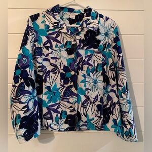 TanJay size 12, petite, beautiful colour jacket with pockets. pit to pit 21 length is 22, 100% polyester very soft.