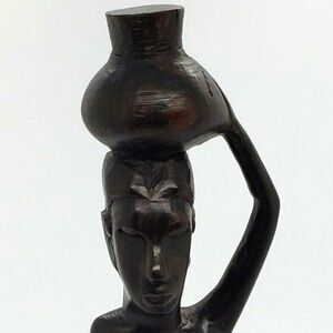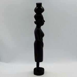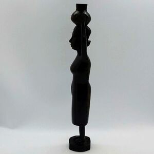 Tanganyika African Hand Carved Wood Tribal Woman & Jug on Head Statue - Vintage! Pre-owned & excellent condition; no signs of chips or cracks; some age appropriate scratching and fading on back confirming it's vintage age. Approx. size: 2.25" (w) x 1.75" (l) x 11.5" (h). Beautifully hand carved black ebony wood African tribal woman carrying basket on head sculpture. Detailed body features adorn this wonderful African heritage statue. Original label: Produce of Tanganyika.
