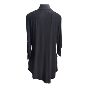 This black blouse features 3/4 sleeves and is beautifully embellished with a V-shaped detail at the neckline, adding a touch of elegance to its design. The soft, flowing fabric ensures a comfortable fit, making it a versatile addition to any wardrobe. Length 25" Bust 36" Sleeves 17"