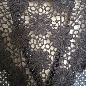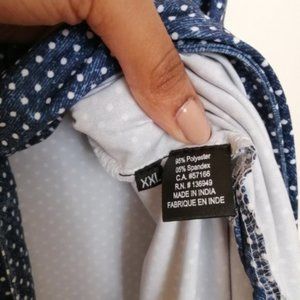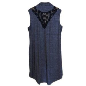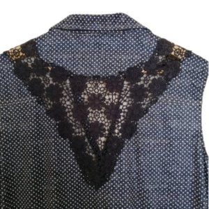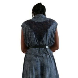 Tango Mango blue polka dot with lace midi dress. It has blue floral lace on the shoulders and on the back of the dress forming a triangular shape. White polka dots and blue color dress. The dress resembles a long dress shirt that could be styled in multiple different ways. Smooth material and some buttons don't connect with a clip.