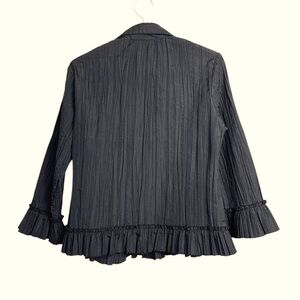 This beautiful blouse is in excellent condition. It has ruffles at the bottom of the sleeves and the bottom of the torso.