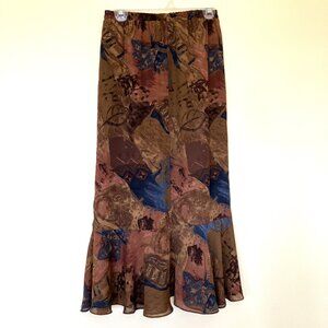 TanJay polyester chiffon maxi skirt has a wide asymmetric ruffle around the skirt hem. Abstract print pattern in brown & blue tones - looks great paired with a denim blouse or jacket. Fully lined. Stretchy elastic waist for easy pull-on style. 100% polyester, machine washable. Women's tag size "8" - see below for garment measurements.