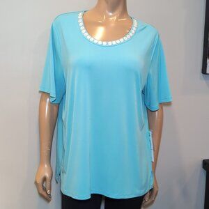 Tanjay Aqua Short Sleeve Top Embellished Scoop Neck Beaded Rhinestone Resort