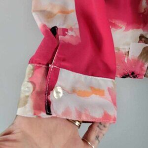 Tanjay Petite Bright floral blouse. Colours pink, tan, orange, black and white. EUC.
