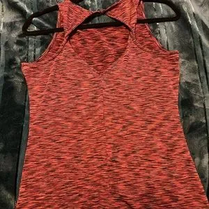 A beautiful tank top with a little open back. Colour is burgundy with lines through out the shirt, size small, Brand Suzy Shier, very comfortable.