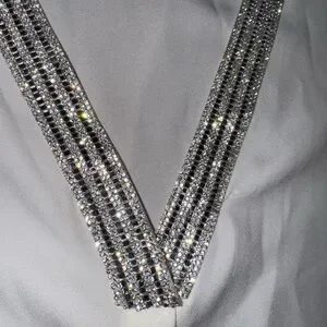 Elegant white sleeveless top featuring bedazzled V-Neck. Perfect for adding a touch of sophistication to any outfit.