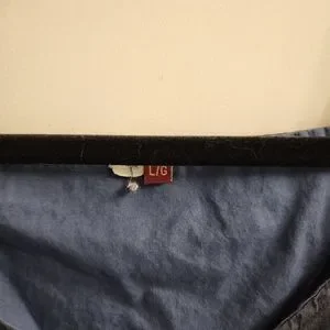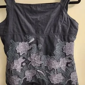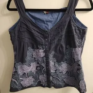 Navy blue tank with purple and light blue accents. lots of detail, buttons. Saya size large but would say medium fit