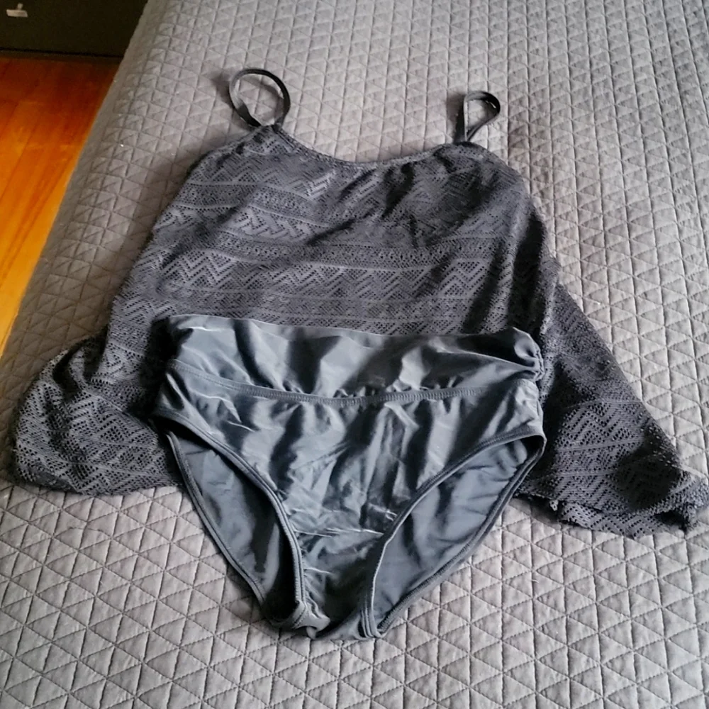 Black tankini. Never worn. High rise bottoms approx 14". Tankini top with padded cups approx 15" pit to pit.