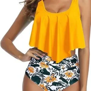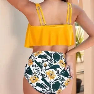 Tempt me Tankini Yellow ruffled top, blue and yellow floral bottoms