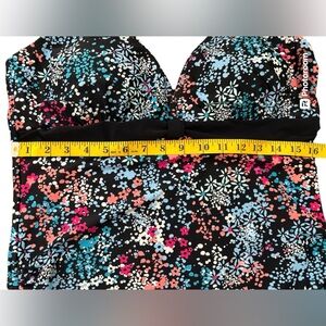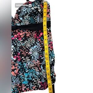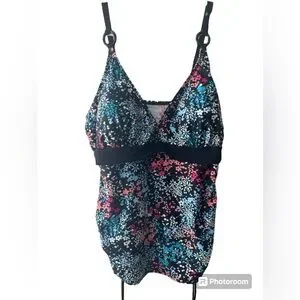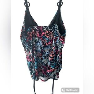 Like new tankini, tag size not found, fits a size large, ruched sides, see measurements